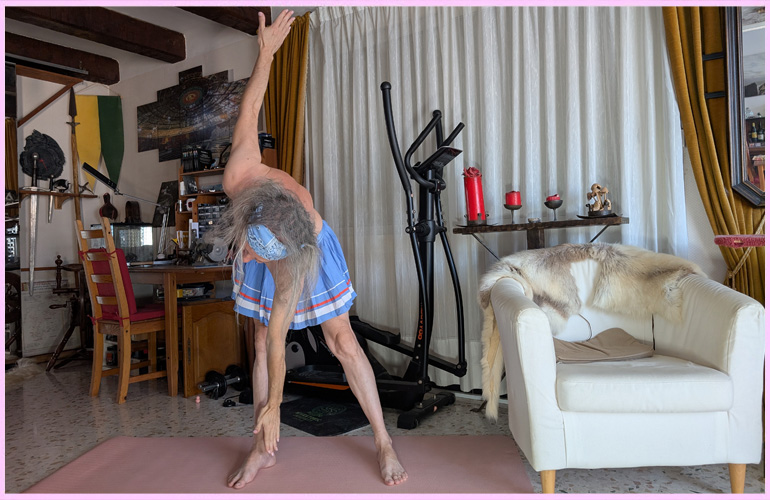On se penche en avant, bras à l'horizontal, puis on touche alternativement chaque cheville avec la main du bras opposé alors que le second bras monte au ciel.