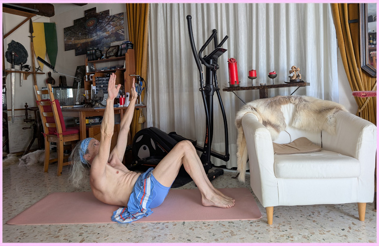 On s'allonge sur le dos, jambes pliées, puis on va lever les bras vers le ciel en décollant les épaules du sol, abdos bien contractés, et on repose.