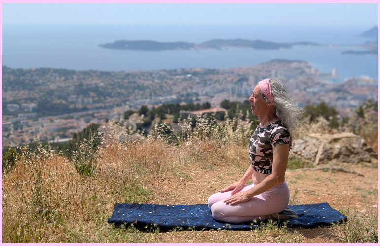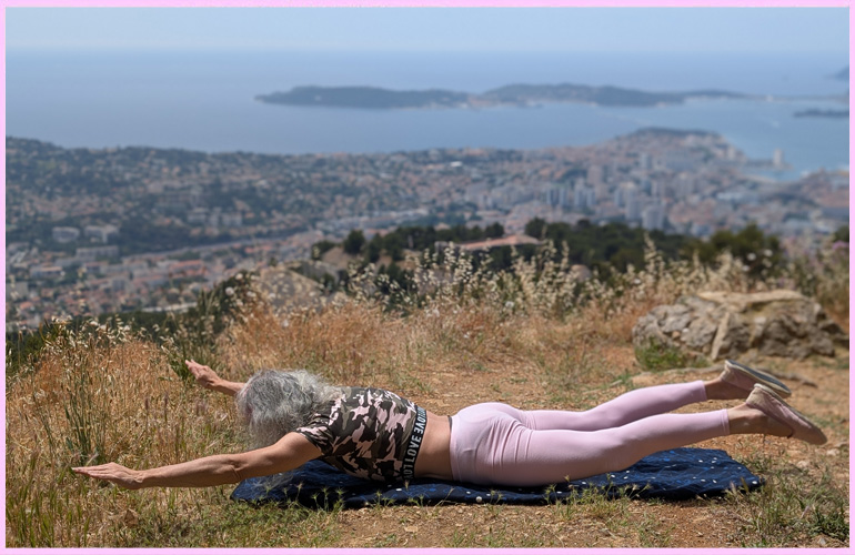 9:00-9:30 - We move our knees back, shoulders above our wrists, arms stretched vertically to find a half-plank position then on an exhalation we will bend our elbows backwards to bring our stomach then our chest and finally our forehead into contact with the ground.