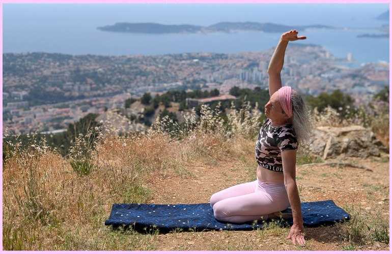 1:30-3:00 - Stretch your back to the sides: Return to the sitting position on your heels very slowly, vertebra by vertebra, until your back is straight. Right hand on the floor (all hands) then raise your left arm above your head and while exhaling bend to the right (your glutes remain in contact with your heels). Stretch your left side well for about thirty seconds while breathing deeply. Return to the central position then do the other side before returning to the sitting position on your heels, back straight.