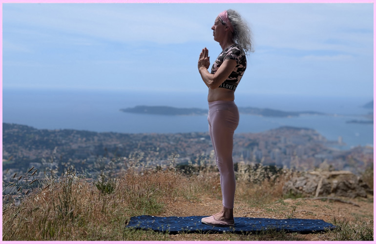 15:15-15:45 - We walk towards the hands and raise our hands to our shins to bring our backs back to a horizontal position. Then we slowly rise to return to a vertical position, our arms rising to the sky and then coming back down to a piazza position, our hands at the level of our solar plexus.