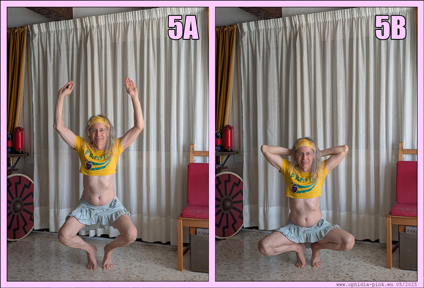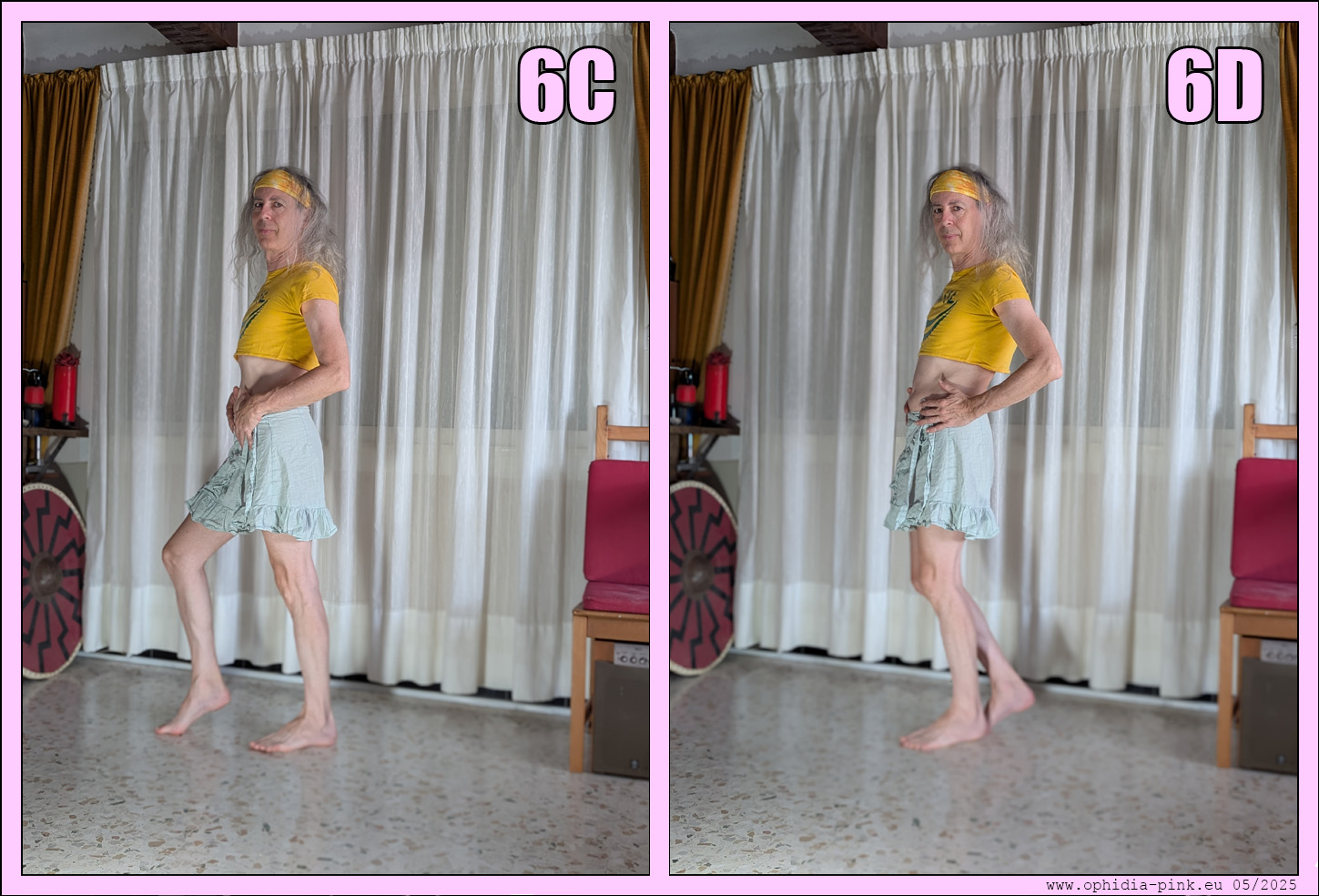 Dans un second temps le talon gauche revient au sol alors que la jambe gauche se raidit et le talon droit quitte le sol alors que la jambe droite se plie. (6D). Pendant ces deux temps on se caresse les cuisses et les fesses avec les mains.