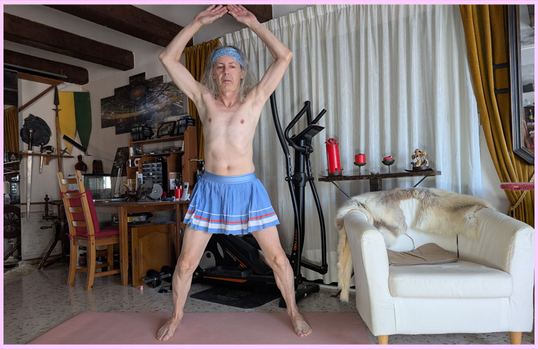 On se penche en avant, bras à l'horizontal, puis on touche alternativement chaque cheville avec la main du bras opposé alors que le second bras monte au ciel.
