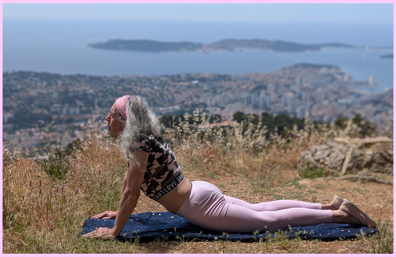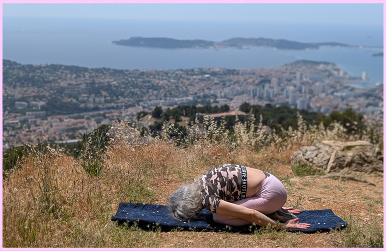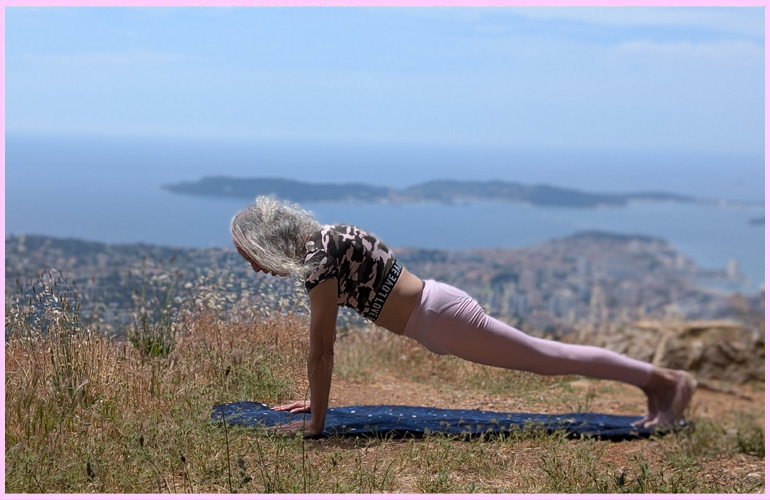 9:00-9:30 - We move our knees back, shoulders above our wrists, arms stretched vertically to find a half-plank position then on an exhalation we will bend our elbows backwards to bring our stomach then our chest and finally our forehead into contact with the ground.