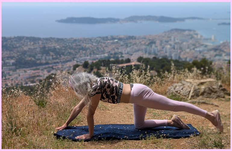 1:30-3:00 - Stretch your back to the sides: Return to the sitting position on your heels very slowly, vertebra by vertebra, until your back is straight. Right hand on the floor (all hands) then raise your left arm above your head and while exhaling bend to the right (your glutes remain in contact with your heels). Stretch your left side well for about thirty seconds while breathing deeply. Return to the central position then do the other side before returning to the sitting position on your heels, back straight.