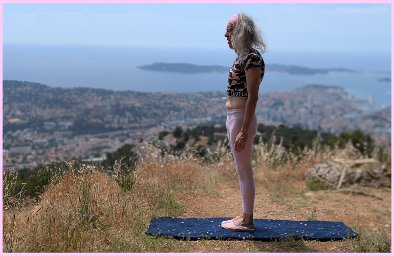 14:00-14:20 - The arms rise to the sky and then come back down in a prayer position, hands at the level of the solar plexus. We then bend forward and bring the hands to the ground.