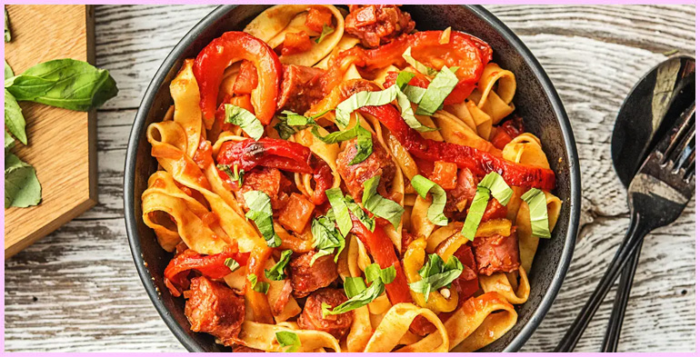A mountainous, rugged, magnificent region where people still eat as if they had to dig a field after every meal. Pasta is practically a national sport here. Pasta with chipolata sausage and bell pepper isn't a classic, codified dish, but it clearly aligns with the cuisines of central and southern Italy, where tomatoes, bell peppers, and sausage are staples.