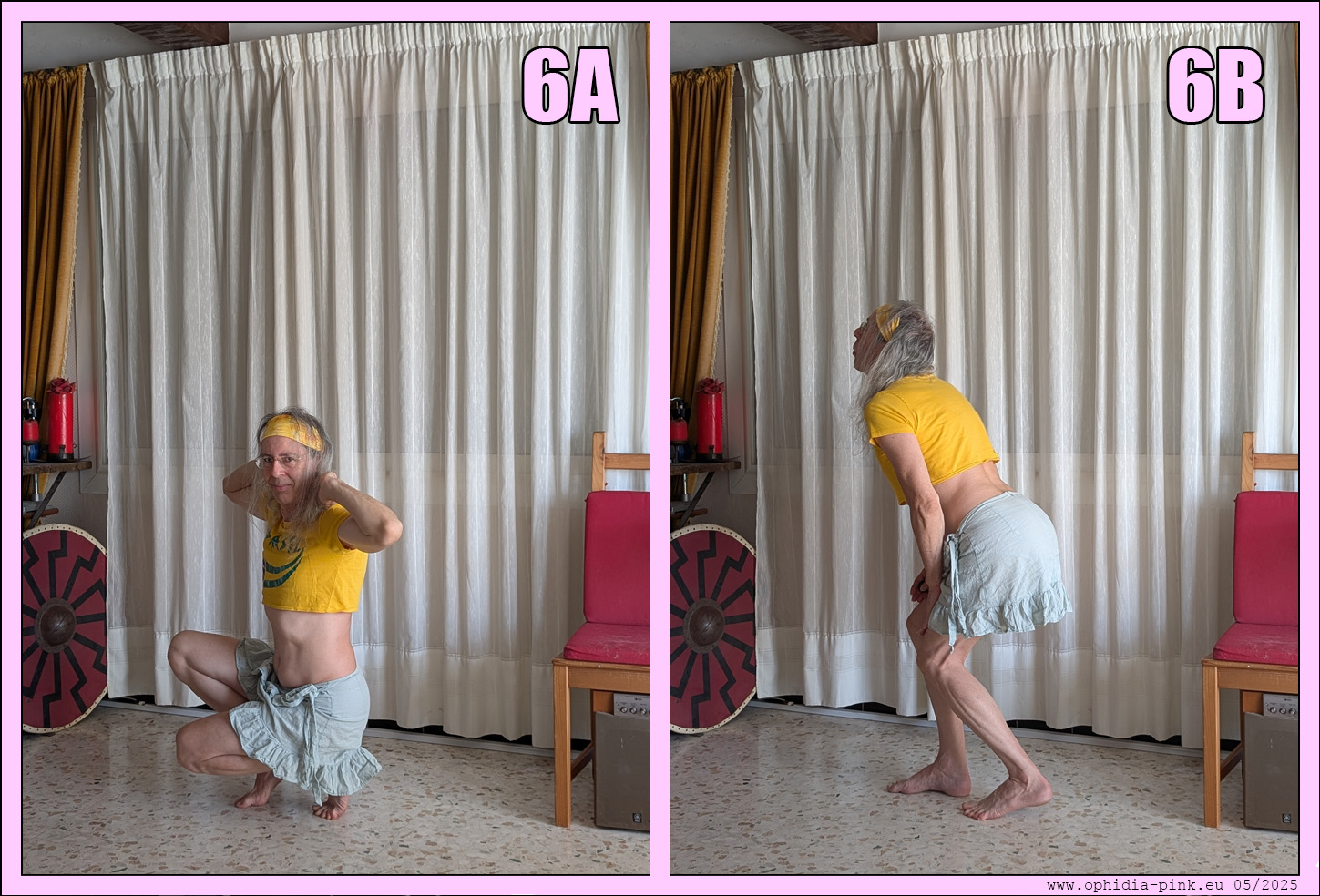 Position 5 vers 6 en deux temps : On se relève en envoyant les fesses le plus en arrière possible (cambrure maximale). Les mains accompagnent le mouvement en carressant le corps. On marque une pause le cul bien offert (6A) puis on finit de se relever pour finir avec la jambe gauche qui porte le corps et le pied droit lègèrement en avant qui touche le sol par la pointe, genou droit plié. Les mais sont sur les hanches. (6B).
